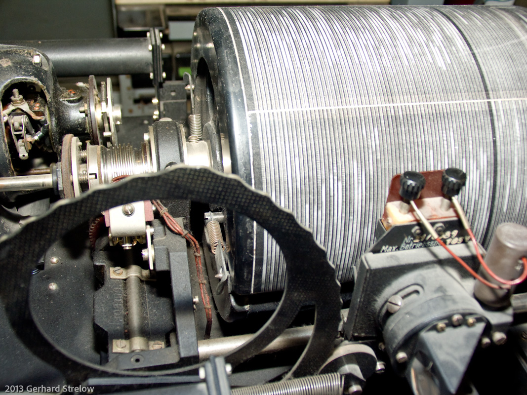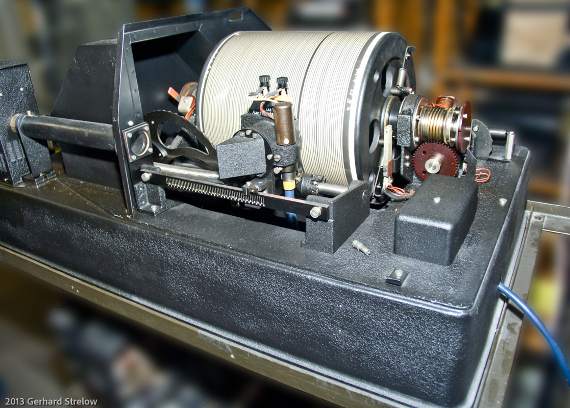 11 Deutschland 1939-1958 Zeitansagegerät 35 von Siemens & Halske, genannt „eiserne Jungfrau“, im Lichttonverfahren: auf einer Trommel sind Zelluloid-Streifen angebracht, die wie beim Tonfilm mit Fotozellen abgetastet werden.