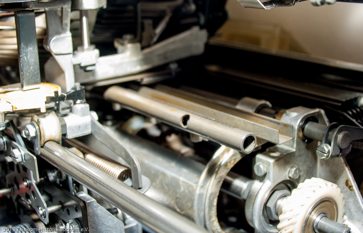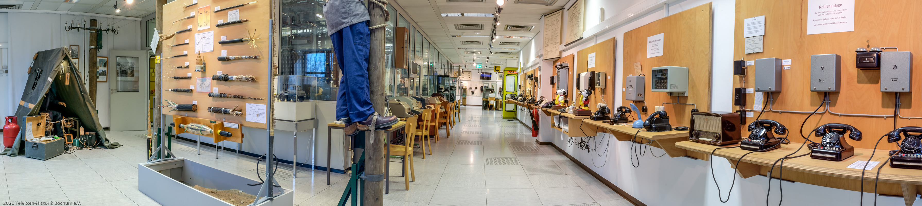 Hier sieht man links unsere Ausstellung Linienbau. Im Gang links die Fernschreiber und rechts Telefone und Nebenstellenanlagen