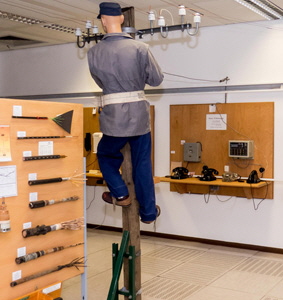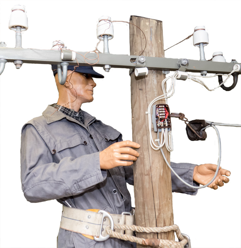 Hier sehen Sie unseren Kollegen Alfred bei der Arbeit. Er war früher in einem Kaufhaus als Schaufensterpuppe beschäftigt, der Job bei uns gefällt ihm jedoch besser. Außerdem zeigt er uns, wie auf einem Mast mit Sicherheitsgurt und Steigeisen gearbeitet wird.