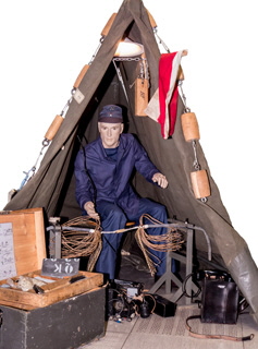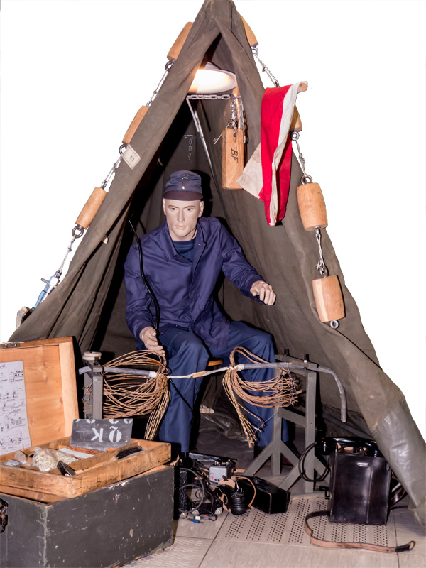 Das Foto zeigt ein Kabellöterzelt. Es wurde eingesetzt, wenn Kabel miteinander verbunden oder Störungen beseitigt werden mussten. Die Fernsprechkabel, die meistens in der Erde liegen, sind sehr empfindlich gegen Feuchtigkeit, besonders wenn bei Arbeiten der Schutzmantel entfernt wird. Das Zelt dient hauptsächlich als Abschirmung gegen Witterungseinflüsse. Man sieht in dem Zelt Jupp beim Arbeiten an einer sogenannte Spleißstelle, in der zwei Kabel miteinander verbunden werden. Es handelt sich hierbei um Bleikabel, das heißt der Schutzmantel der Kabel besteht aus Blei. Wenn alle Leitungen durchverbunden sind, wird aus Blei eine sogenannte Muffe geformt. Diese wird über die Spleißstelle gelegt und dann mittels einer offenen Propangasflamme verlötet. Alle Werkzeuge, die man dazu braucht, sind in dem Zelt zu sehen. Außerdem Prüfgeräte, mit denen man testen kann, ob auch die richtigen Leitungen miteinander verbunden sind.