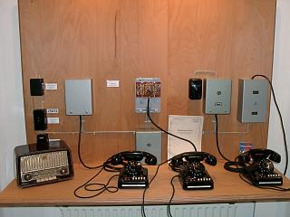Diese Telefonanlagen waren früher oft in kleinen Büros oder Geschäften im Einsatz. Sie sind in der Sammlung an unsere Vermittlungsstelle angeschlossen, so dass man ihre Funktionsweise demonstrieren kann. Auf dem Bild ist noch ein altes Radio zu sehen. Der Antenneneingang ist an einer Drahtfunkanlage angeschlossen. Diese Anlagen gab es in den fünfziger Jahren. Damit wurden die Mittelwellensender über die Telefonleitungen übertragen, was einen störungsfreien Rundfunkempfang ermöglichte.