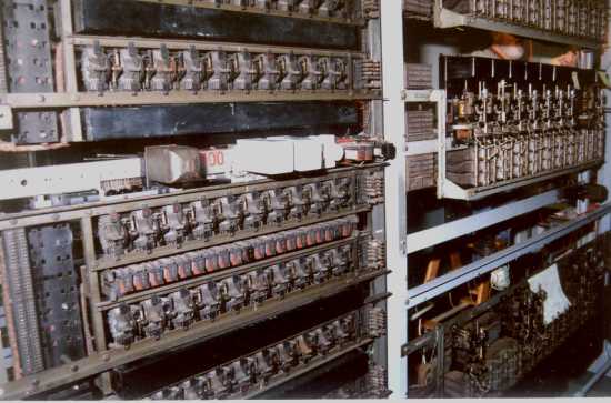 Das Bild zeigt die Gestellreihe mit dem Wählsystem22 aus unserer Sammlung. Zu sehen sind die Vorwähler, dahinter weitere Wahlstufen.