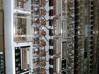 Das Bild zeigt die Gestellreihe mit dem Wählsystem 55v aus unserer Sammlung. Bei diesem System werden die gleichen Wähler und im Prinzip die gleiche Schaltungstechnik wie beim 55 System verwendet. Das v steht für vereinfacht, da man auf einen großen Teil der Blechverkleidung verzichtet hat. Auch die Schaltung ist im Detail verbessert worden.