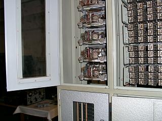 Das Bild zeigt die Gestellreihe mit dem Wählsystem 56/ 58 aus unserer Sammlung. Es wurden motorgetriebene Wähler benutzt, die sich allerdings erheblich von den EMD-Wählern unterschieden. Zum Beispiel gab es keine mit Edellmetall versehenen Kontakte. Dieses System ist von der Firma Siemens in den 30. Jahren des vorigen Jahrhunderts entwickelt worden. Während des 2. Weltkrieges wurden die Entwicklungsarbeiten unterbrochen und erst 1955 mit der Einführung des EMD-Wählers beendet. In der ehemaligen DDR baute der VEB-RFT die Vorkriegsversion mit Bronzeschaltarmsatz bis 1991 nach.