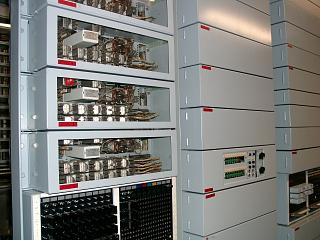 Das Bild zeigt die Gestellreihe mit dem Fernwahlsystem 62 aus unserer Sammlung. Darüber wurde bis zum Jahr 1995 der Fernverkehr in Gelsenkirchen abgewickelt.