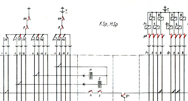 Der Schaltplanauszug zeigt die Zusammenarbeit zwischen Register und Umwerter. Bei einer Anfrage sind alle Kontakte in der rot gezeichneten Stellung. Es ist der z2-, der h2- und der k2-Kontakt geschlossen. Das entspricht der Vorwahlnummer 0222. Im Umwerter gibt es dafür in der Eingabematrix entsprechende Brücken, über die dann das H- und Z-Relais anspricht. Die zugehörigen Kontakte h und z schließen und legen Erdpotential an die Ausgabematrix. Davon ist nur ein kleiner Teil in unserem Auszug, man sieht nur die Ansteuerung der Relais, die für die Einstellung der Richtungswähler verantwortlich sind. Die Übermittlung vom Register zum Wähler geschieht im Binärcode, in unserem Fall würde durch die Diodenbrücken das F8-, bzw. das G2- und G4- Relais ansprechen. Die F-Relais sind für den KRW, die G-Relais für den II RW zuständig. (siehe Blockschaltbild) Der KRW würde also Richtung 8 ansteuern, der II RW Richtung 6. Auf der nächsten Seite, die den Aufbau zeigt, kann man sehen, wie die “Programmierung” in der Praxis aussieht.