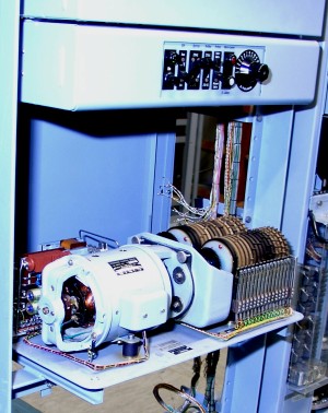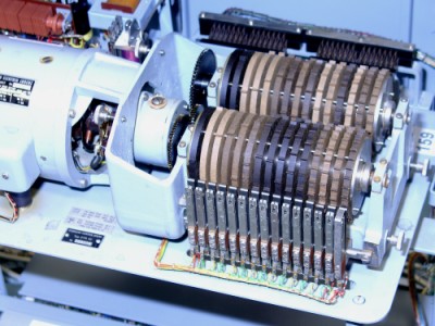 Die Bilder zeigen den Zeittaktgeber aus unserer Ferngruppe. Er besteht aus einem Gleichstrommotor mit Getriebe, der 2 Nockenwalzen antreibt. Man sieht auf dem unteren Bild die verschiedenen Scheiben, vor denen Kontakte sitzen, die von den Nocken betätigt werden. Der Motor muss natürlich mit konstanter Geschwindigkeit laufen. Deshalb hat er eine Hilfswicklung, die eine Tonfrequenz erzeugt. Mit dieser Frequenz wird der Motor über eine elektronische Schaltung gesteuert.
